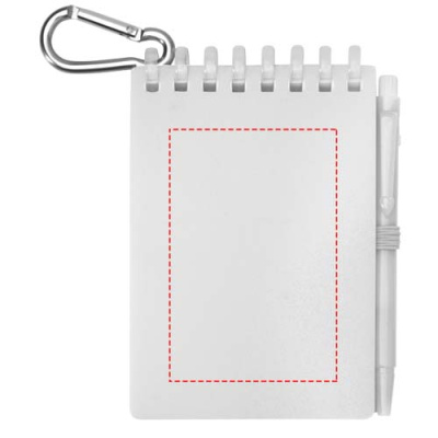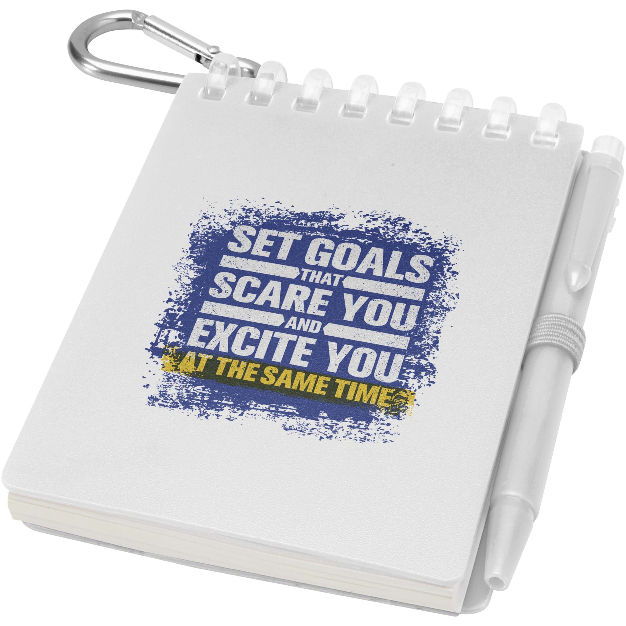 Das Lig Mini Notizbuch und Stiftset ist ein kompakter und praktischer Begleiter für Notizen unterwegs. Das spiralgebundene Notizbuch verfügt über einen weichen Einband aus recyceltem Kunststoff sowie 70 leere Seiten aus 120 g/m² wasserfestem Steinpapier und ist somit ideal für die Verwendung im Freien geeignet. Mit seinen abgerundeten Ecken und der integrierten Stifthalterung folgt es dem Trend zu Mini Formaten und bleibt dabei funktional. Der passende Kugelschreiber besteht aus recyceltem ABS Kunststoff, schreibt mit schwarzer Tinte und hat eine Schreiblänge von 250 Metern. Ein farblich abgestimmter Metallring ermöglicht die einfache Befestigung des Sets an einem Rucksack, einer Handtasche oder einem Schlüsselbund. Somit eignet es sich perfekt für Notizen unterwegs. Notizbuchformat: 11 × 7,5 cm.