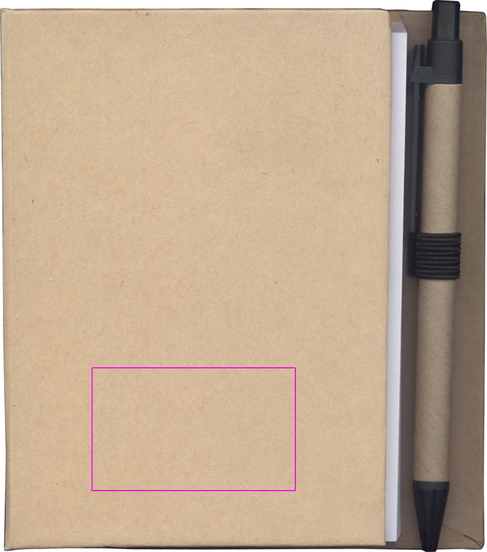 Eco-looking notepad with 200 pages, yellow sticky notes (25 sheets), five differently colored marking strips (25 strips in each color) and a ballpen. We print your logo on the cover.