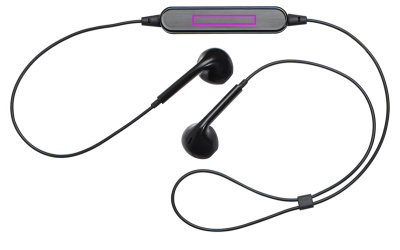 Plastic bluetooth headset with hands-free and volume control, USB charging cable included. Your logo will be printed on the volume control.