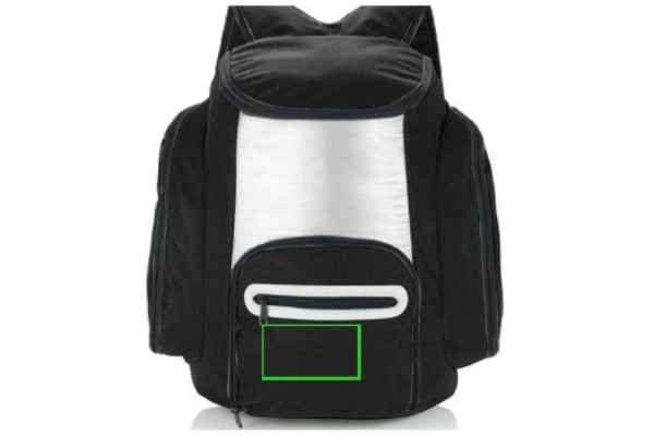 600D cooler backpack with silver lined insulation inside to keep all your food and beverages cold. On the front there’s an additional zipped pocket for storing your other belongings.
