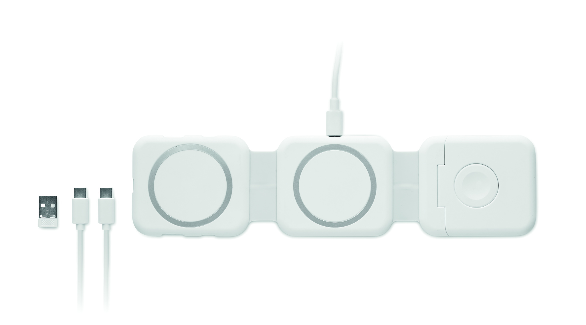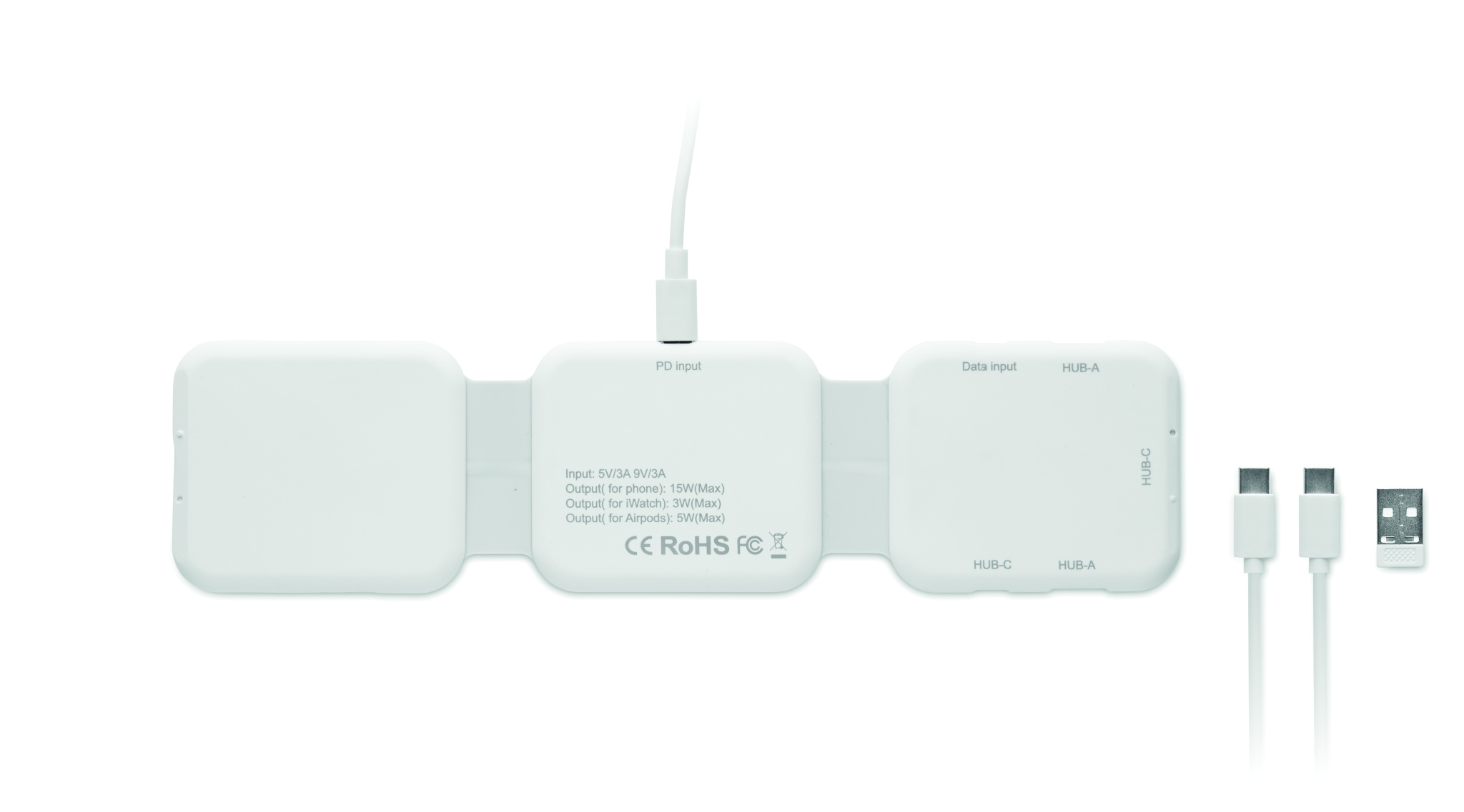 Magnetic charging station in ABS. 3 wireless charging spots. 1 x 15W, 1 x 5W for TWS and 1 Apple Watch charger (3W). 2 Type-C & 2 USB-A HUBS. Integrated cable input: connector from Type-C to USB-A.