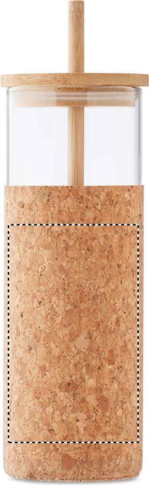 Borosilicate glass tumbler with cork protective sleeve and bamboo lid and straw. Capacity 450 ml. As this is a single wall mug heat transfer can still occur. Bamboo is a natural product, there may be slight variations in colour and size per item, which can affect the final decoration outcome.
