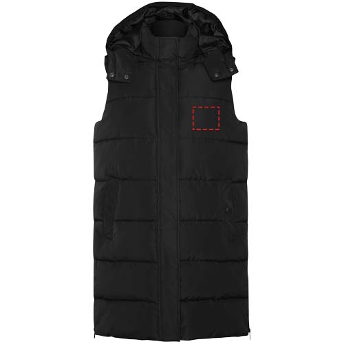 Padded bodywarmer with removable hood. High collar. Front zip closure hidden by flap. Two pockets with snap button closure. Side openings with zippers. Interior chest access. Water repellent.