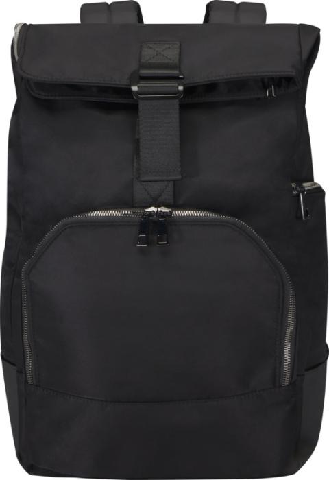 The Rhine rolltop backpack enables you to shift between work and leisure life seamlessly with its sleek style and versatility. Crafted with high-quality GRS certified recycled nylon, soft RPET lining, and premium PU leather elements. The backpack features a dedicated 15” laptop compartment with 2 additional pockets for electronic accessories, a main compartment with a practical L-zip entry and 2 pockets, a zipped organisational front pocket, and a side pocket. Enjoy maximum carrying comfort with the padded and adjustable shoulder straps, and PU wrapped top handle. Volume capacity: 18 litres. Resistance up to 10 kg weight. PVC free.