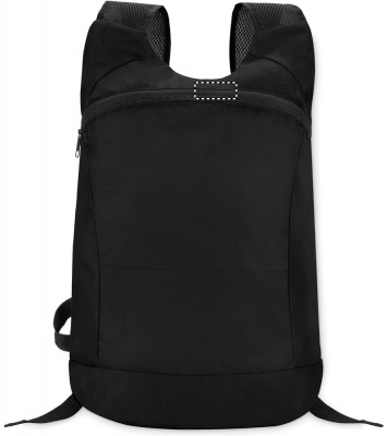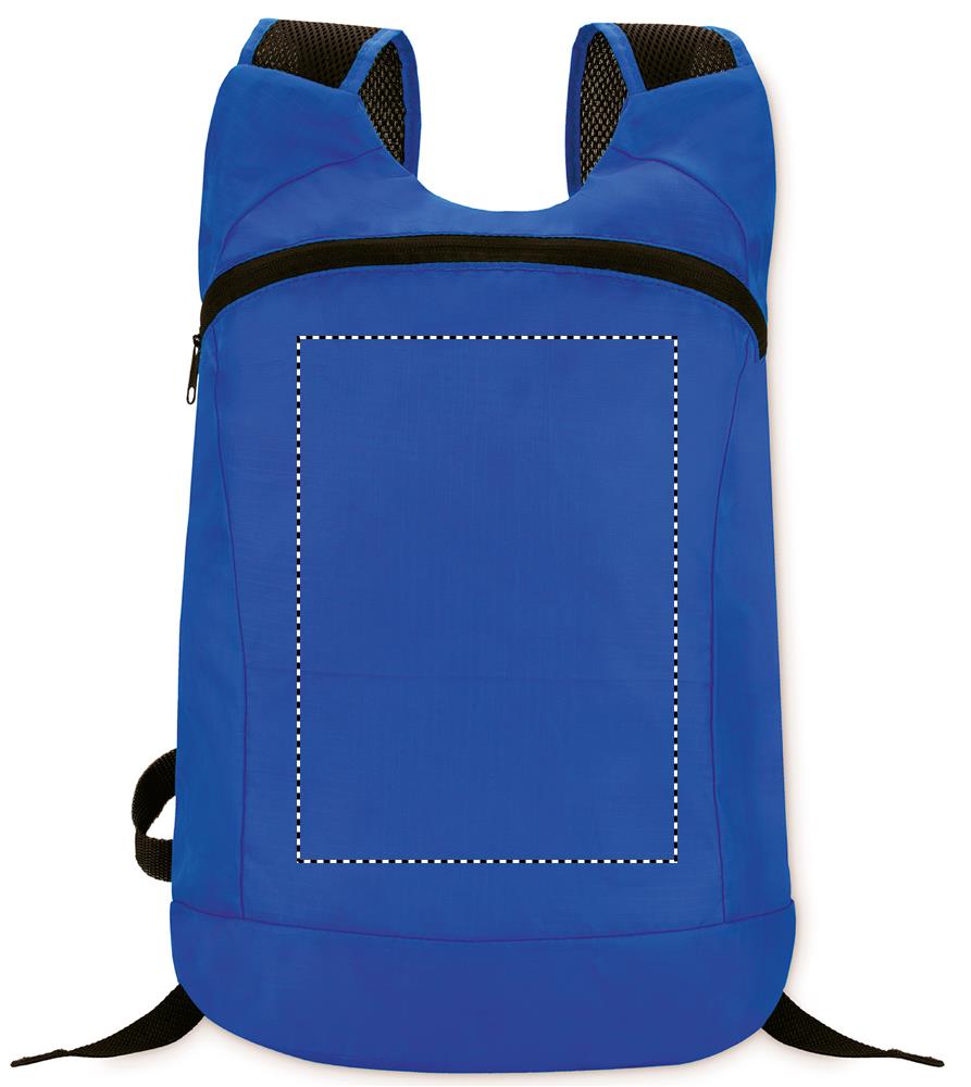 Foldable sports rucksack in ripstop polyester with zippered front opening, mesh shoulder strap and detachable pouch.