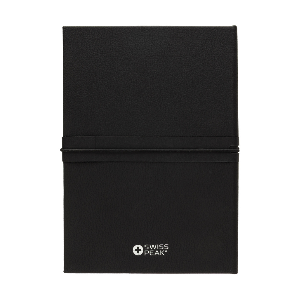 This luxury gift set includes all the essentials you need to get through your workday with comfort and style. The 480 ml double-walled water bottle is made from recycled stainless steel and features vacuum insulation to keep your drinks hot or cold for hours. Thanks to its leak-proof lid, you can carry it with confidence—no spills, no worries.To keep your most important keys always within reach, the set includes a premium Swiss Peak keychain with a glossy metallic finish and a beautifully crafted PU leather strap.Need to capture your ideas on the go? The set also includes a sleek business ballpoint pen with an 1000 metre writing capacity, paired with a soft-touch notebook made from recycled polyester PU. Inside, you'll find 160 cream-coloured pages made from recycled paper—perfect for jotting down notes, ideas, or to-do lists.All items are RCS certified, ensuring a fully verified supply chain for all recycled materials used.