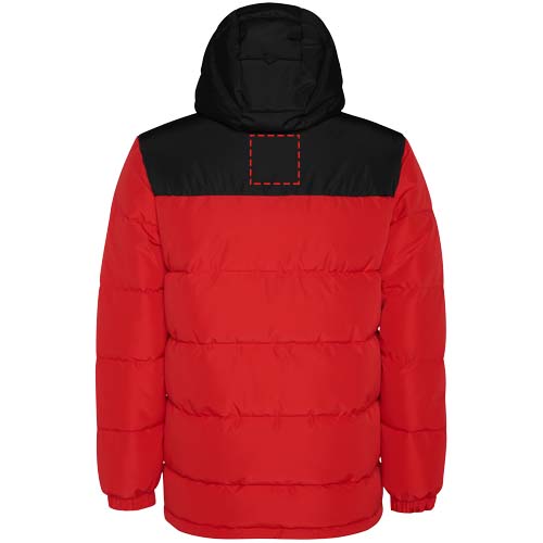 Padded jacket with fixed hood. Front zipper covered with a placket. Chin guard. Two side pockets with zip. Elastic cuffs.
