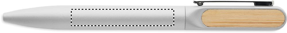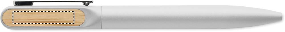 Keeratava kujuga pastapliiats taaskasutatud alumiiniumist korpuse, taaskasutatud ABS-plastist keermega osa ja bambusdetailidega metallklambriga. Sinine tindiga.