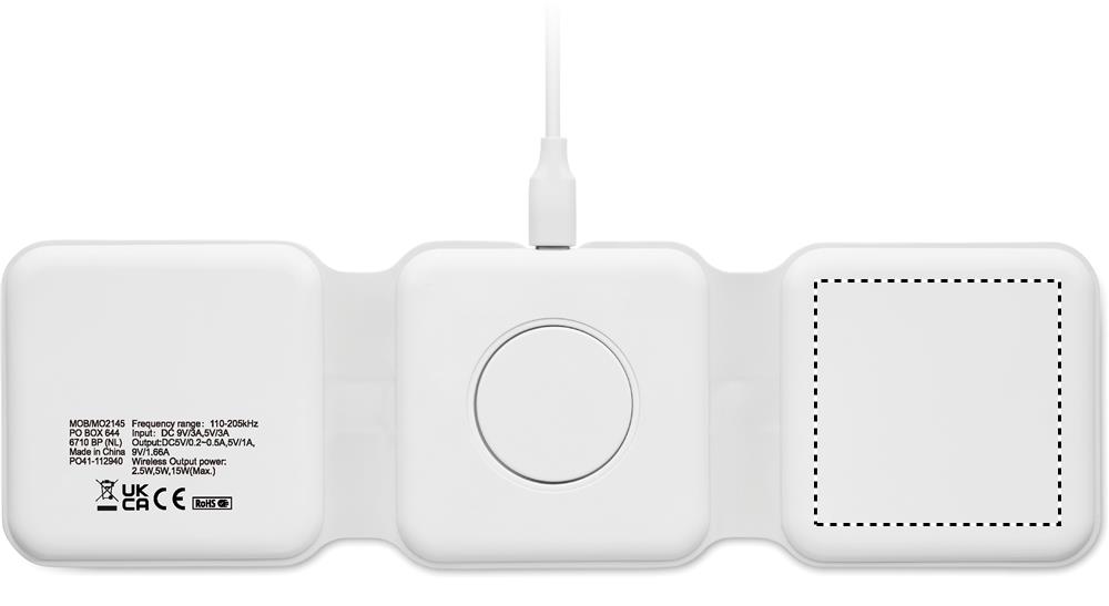 Kolm-ühes kokkupandav ABS-laadimisjaam. Sellel on 3 juhtmevaba laadimiskohta (15 W). Sisend: 2-in-1 Type-C ja Type-A. Ühildub kõigi QI-toega seadmetega, nagu uusimad Androidid, iPhone® 8, X ja uuemad. Ühildub ka iWatchiga.