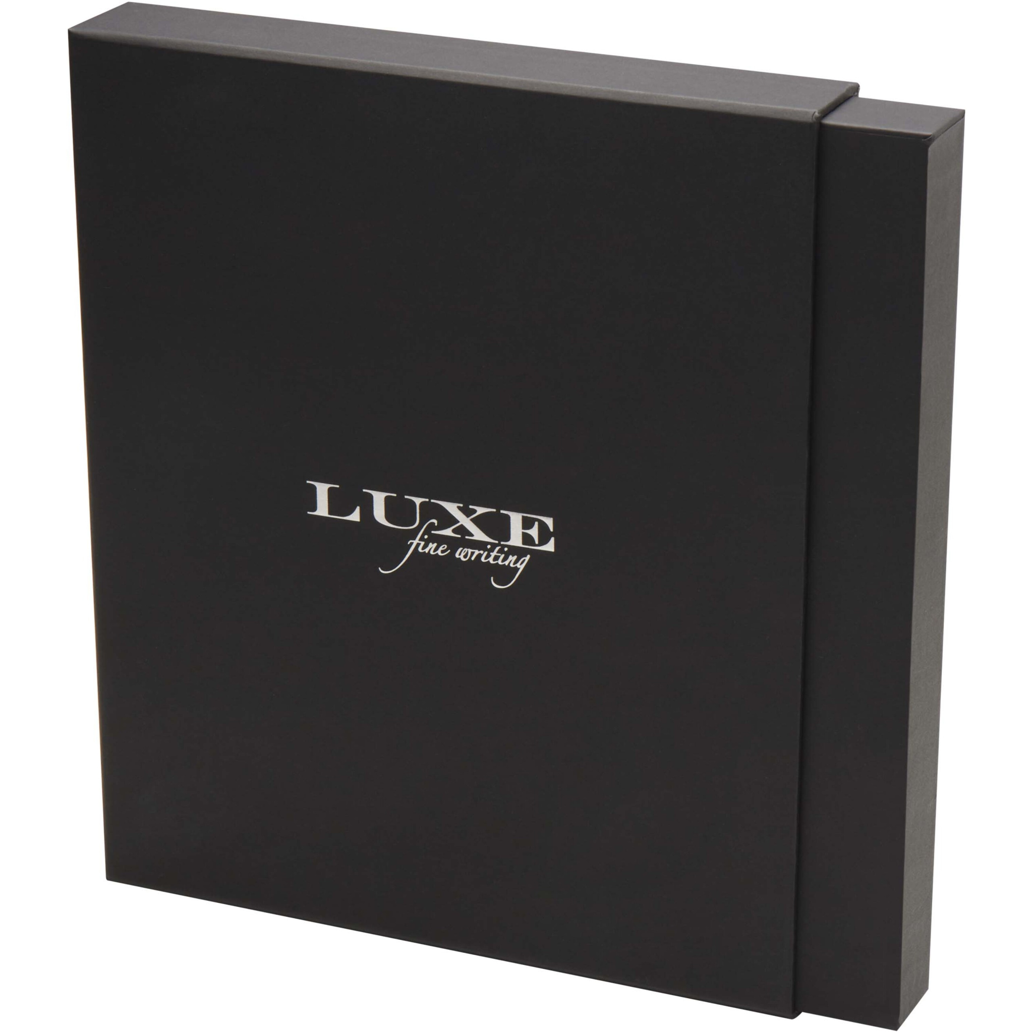 Elegantne Legato komplekt toon-toonis A5 märkmiku ja pastapliiatsiga. Pastaka ülemine osa on valmistatud RCS-sertifitseeritud taaskasutatud messingist hõbedase kroomitud viimistlusega. Tindi värv: sinine. Kirjutuspikkus: 400 meetrit. Otsa läbimõõt: 0,7 mm. Märkmikus on 80 lehte 80 g/m² kreemikat paberit, nahaimitatsiooniga kaaned, kummipael, järjehoidja ja lõõtsaga tasku.