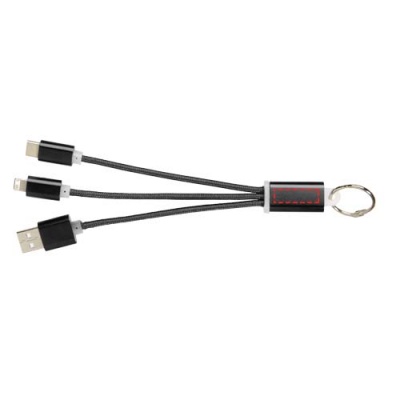 Metallist kolm-ühes laadimiskaabel võtmehoidjaga. Metallist kolm-ühes laadimiskaablil koos võtmehoidjaga on üks C-tüüpi, üks A-tüüpi USB-liides ja kaks-ühes-kahe-ühes-ühilduv ots nii Apple iOS-i kui ka Android-seadmete jaoks. Kaasas võtmehoidja. Apple'i seadmete laadimiseks pane seadmesse kaabel selle küljega, millel pole kontakte, Androidi seadmete laadimiseks aga selle poolega, millel on kontaktid. .