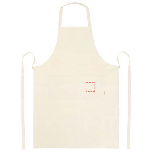 100% OCS-sertifitseeritud 200 g/m² India päritolu orgaanilisest puuvillast põll, millel on kaks kõrvuti asetsevat taskut suurusega 45 x 20 cm ja 1-meetrine seotav kinnitus. Kaelarihma pikkus: 55 cm.