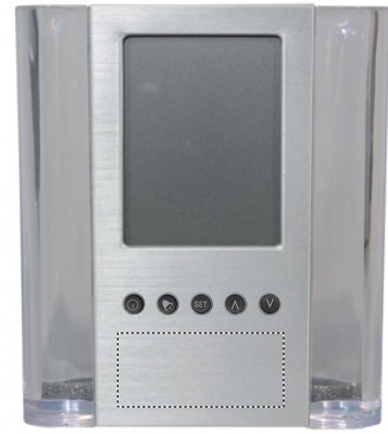 Kalendri äratuskella ja termomeetriga pastakahoidja. Kaasas 1 aku.