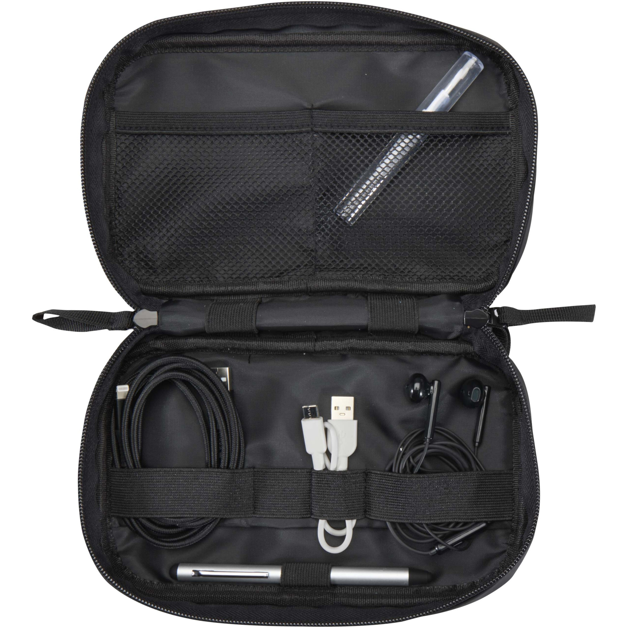 GRS-sertifikaadiga taaskasutatud PU-nahast ja sobiva RPET-voodriga tehnikakott on loodud reisijatele, kaugtöötajatele ja tehnikahuvilistele. Kompaktne ja hõlpsasti seljakotis või käsipagasis kantav kott on varustatud lukuga põhiosaga, kus on praktilised organiseerimisfunktsioonid, sealhulgas elastne pliiatsitasku, kaks võrgust taskut kõrvaklappide ja väikeste tarvikute jaoks, tugevdatud vahesein ja mitu elastset aasa kaablite, USB-mälupulkade ja laadijate turvaliseks hoidmiseks. Välisküljel on esitasku kiireks juurdepääsuks takjakinnitusega ja mugav rihmaga käepide. Veekindla kattega kott hoiab teie olulised asjad kaitstud kõikjal, kuhu lähete. Mahutavus: 1 liiter.