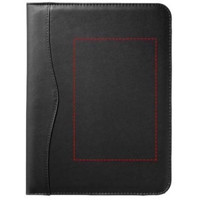 Kansiossa on kynälenkki, asiakirjataskut ja 20 viivoitettua muistipaperia. Kynä ja tarvikkeet rekvisiittaa.