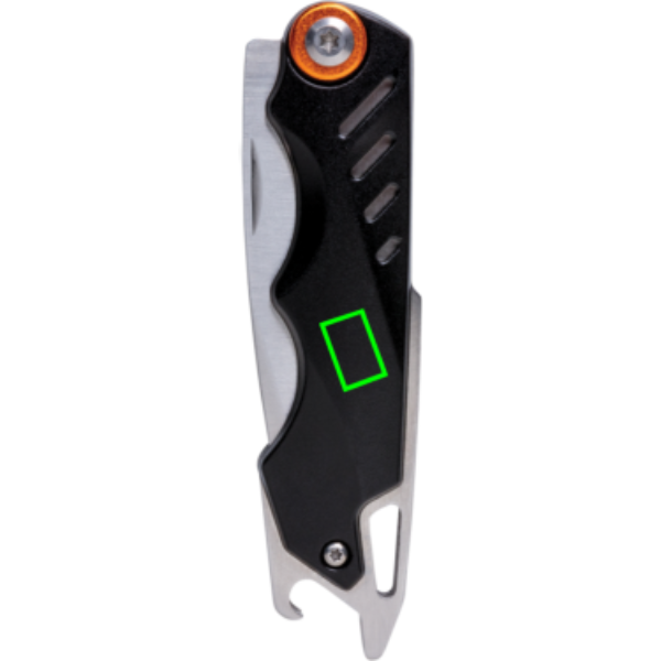 Huippukestävä veitsi, jossa 4 toimintoa. Pakattu ylelliseen lahjapakkaukseen, ml. huippulaatuinen 1680D-pussi. Alumiinirunko ja ruostumattomat terästyökalut. Työkaluihin kuuluvat: Sisään taitettava terä, terän lukitus, vyöklipsi, pullonavaaja.