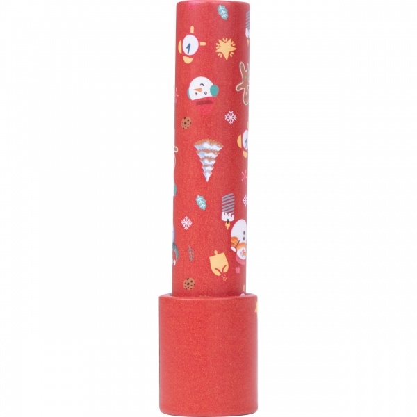 Jouluaiheinen kaleidoskooppi. Jokainen käänne luo uusia, kiehtovia muotoja ja värejä. Logosi kiinnitetään kaleidoskoopin etuosaan tarran avulla.