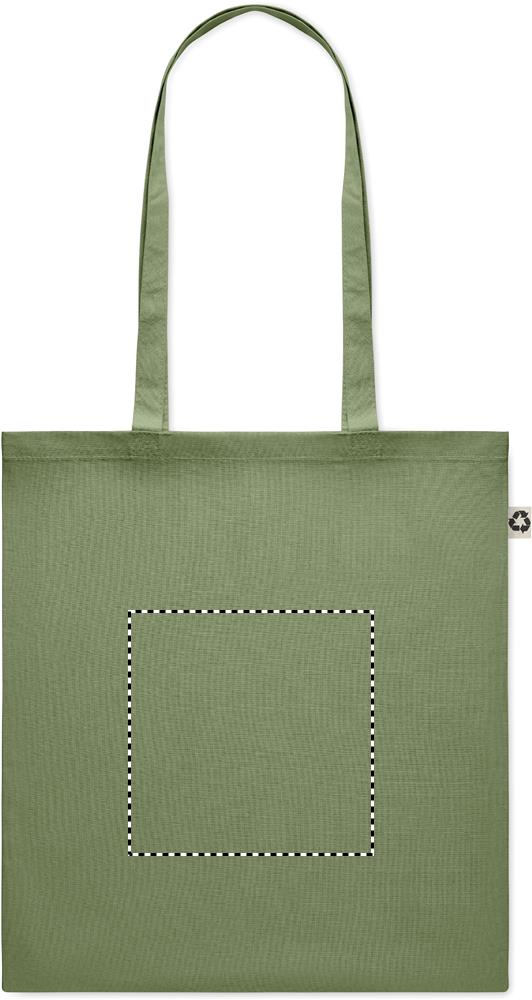 140 gr/m² kierrätetystä puuvillasta valmistettu kassi (65 % kierrätettyä puuvillaa, 35 % tavallista puuvillaa), pitkillä kahvoilla.