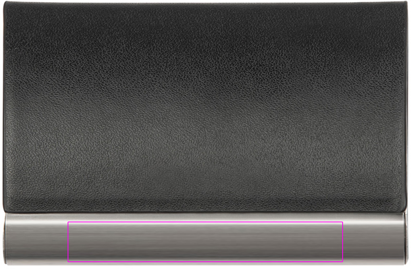 Metallinen käyntikorttiteline, jossa keinonahkainen kansi ja magneettisuljin. Logo on laseroitu metallinauhaan.