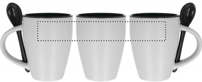 Kaksivärinen keraaminen kahvimuki 250 ml, sisältää lusikan. Tampopainatus kestää vain käsinpesun, keraaminen painatus on konepesun kestävä. Mikroaaltouunin kestävä, yksittäispakattuna 11,5x10,5x9,3cm laatikkoon.