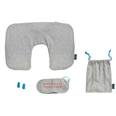 Pehmeässä matkasetissä on puhallettava niskatyyny, jossa on kirkkaansininen vetoketju, kirkkaansiniset elastiset silmäsuojat ja kirkkaansiniset pehmeät korvanapit pehmeässä pussissa, jossa on kirkkaansininen kiristysnyöri.