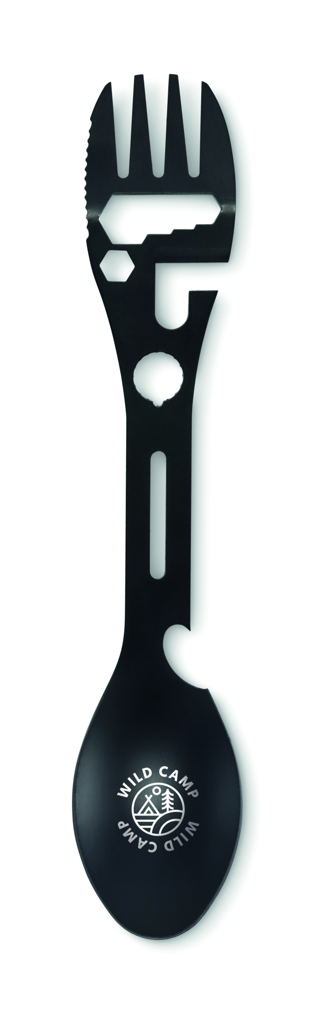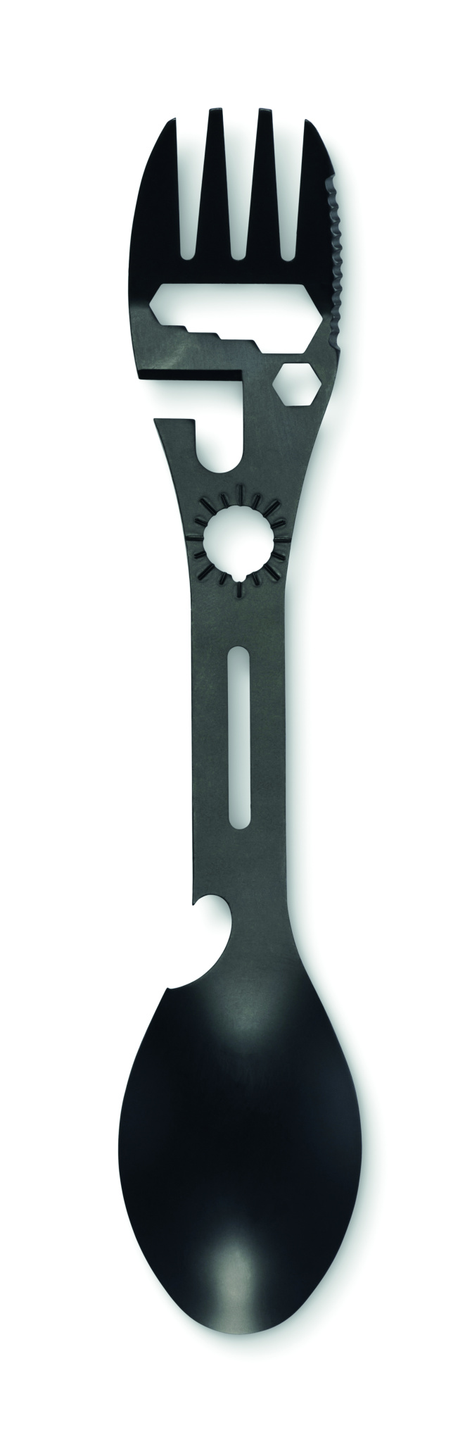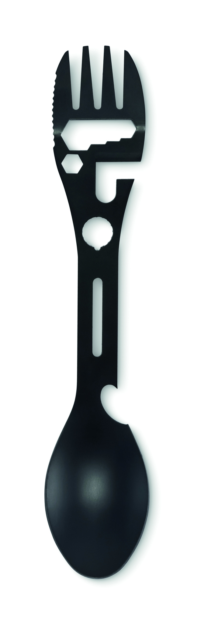 Ruostumattomasta teräksestä valmistetut monitoimiaterimet. Sisältää lusikan, haarukan, säädettävän jakoavaimen, pullonavaajan, kuusiokoloavaimen, sahalaitaisen veitsen, avaimen ja paikoitusavaimen.