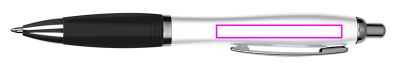 Kuulakärkikynä, jossa valkoinen piippu, metallipidike, sininen kirjoitus iso täyttö ja värillinen pehmeä kosketuskahva. Painamme logosi leikkeen oikealle puolelle.