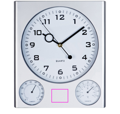 Tyylikäs seinäkello hienovalkoisella kellotaululla ja mattahopealla pinnalla; näyttää ajan, kosteuden ja lämpötilan. Painamme logosi hygro- ja lämpömittarin väliin.
