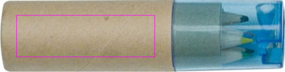 Pahvilaatikko, jossa kuusi lyhyttä, paksua värikynää ja integroitu teroitin sinisellä läpinäkyvällä muovikannella. Painamme logosi laatikkoon.