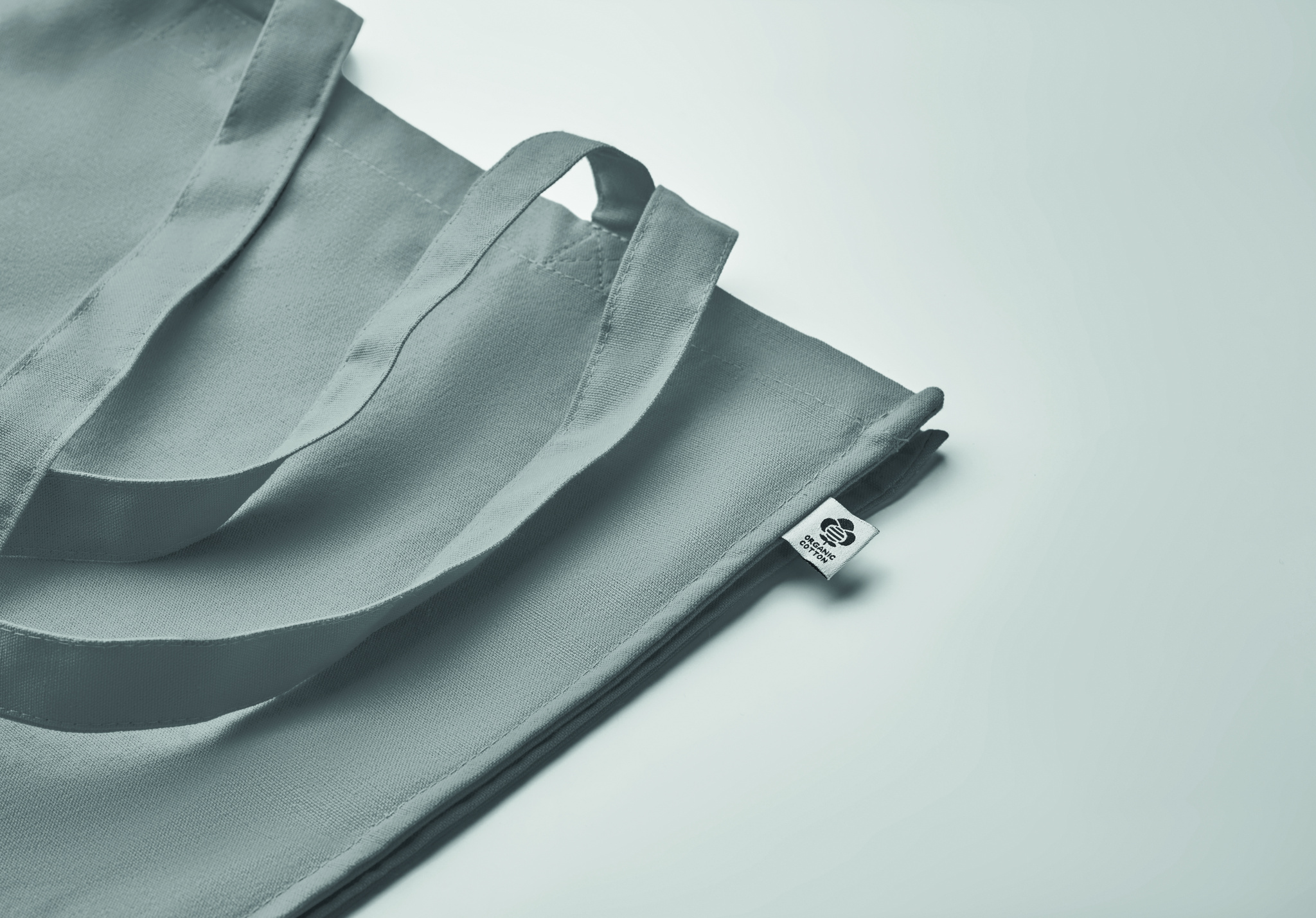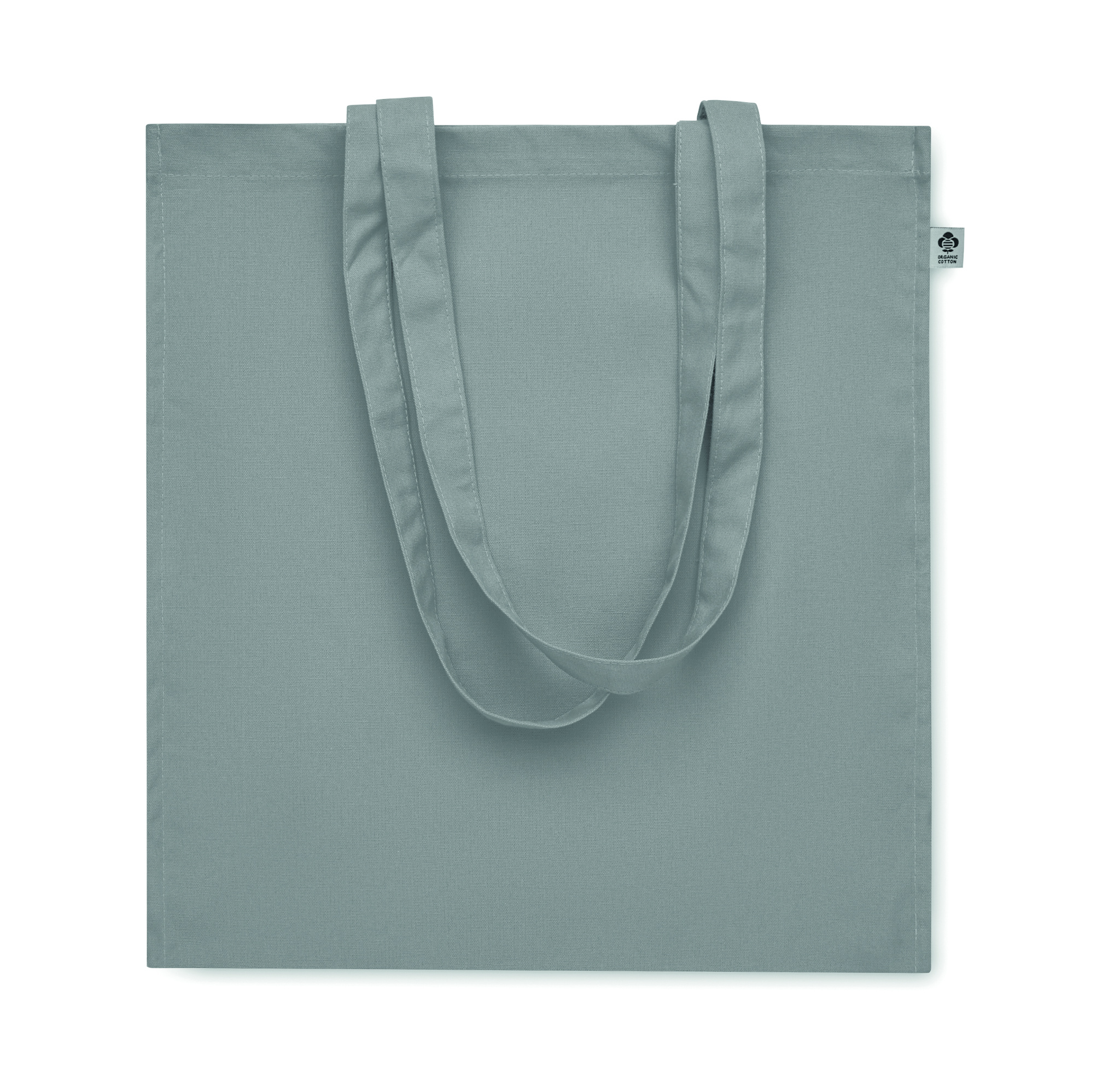 Luomupuuvillasta valmistettu ostoskassi, jossa on pitkät kahvat ja sivutaitteet. 220 gr/m².