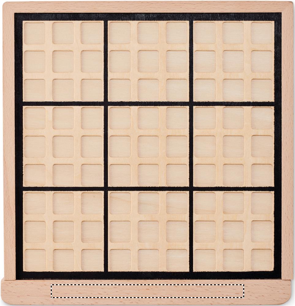 Puusta tehty sudokutaulu. Sisältää 99 numeroitua puulaattaa. Mukana peliopas, jossa ohjeet, arvoitukset ja ratkaisut.