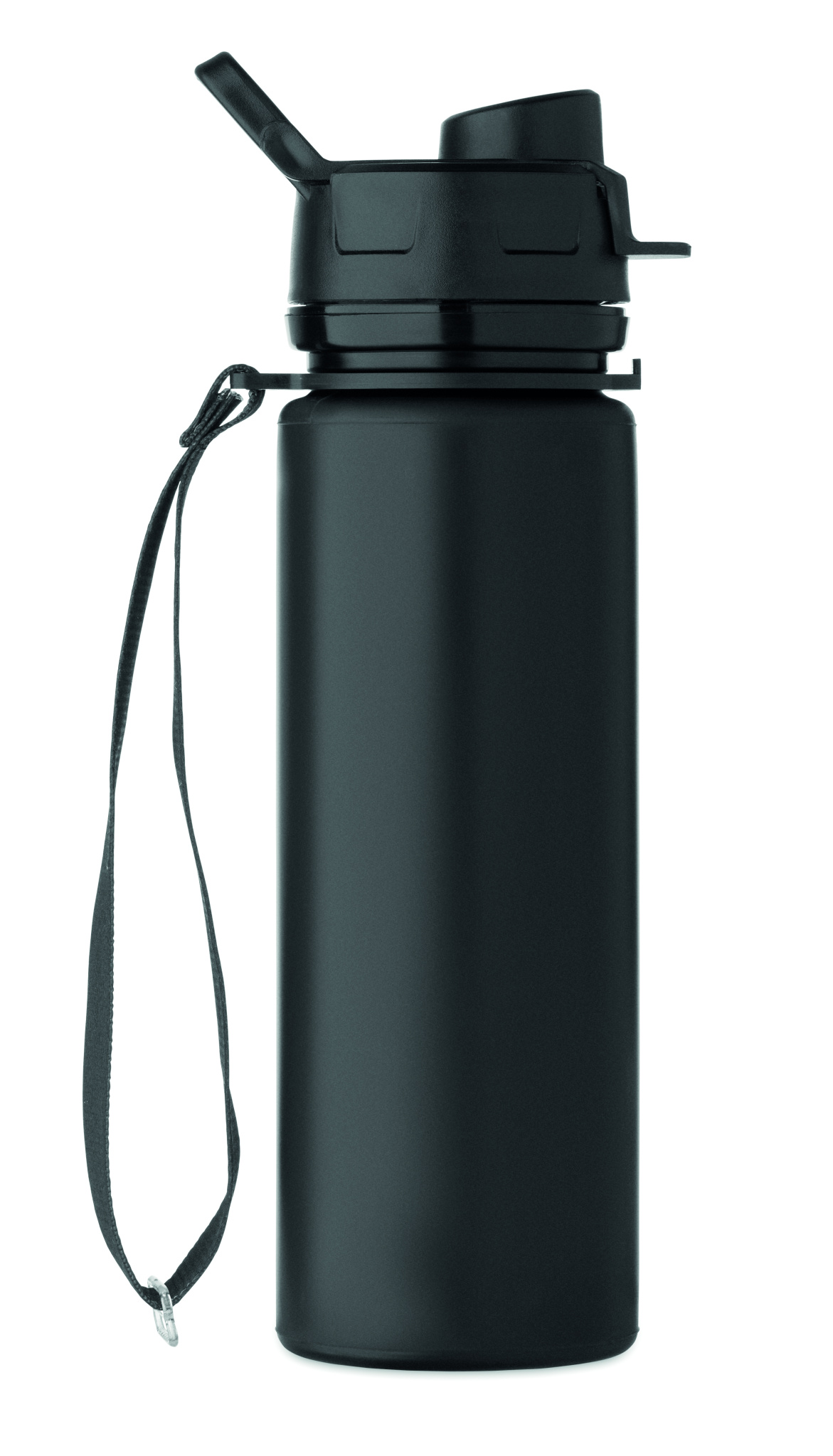 Kokoontaitettava silikoniurheilupullo, jossa on PP-kansi, kahva, polyesterihihna ja läpinäkyvä solki, joka kiinnittää pullon kokoontaitettuna. Vuotamaton. Tilavuus 500 ml.