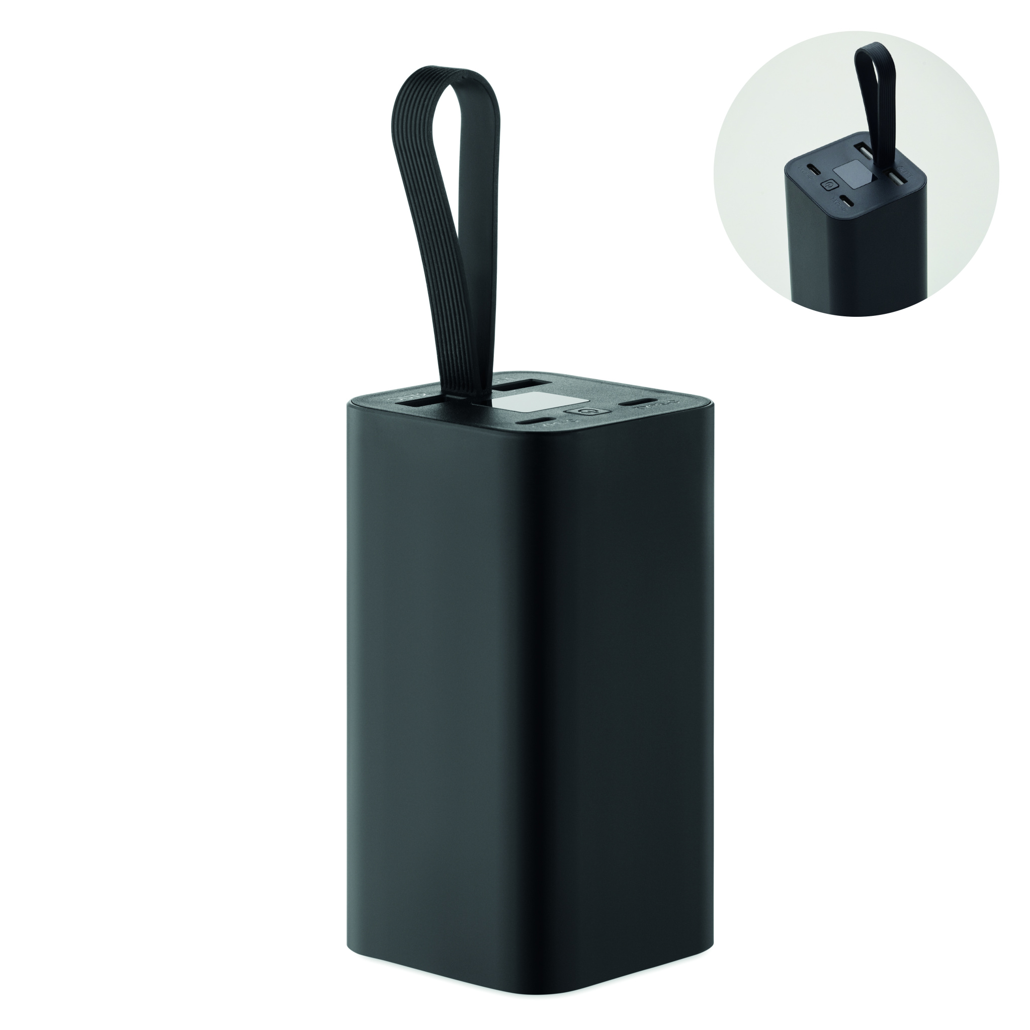 20 000 mAh:n varavirtalähde kierrätetystä alumiinista, jossa on digitaalinen virtanäyttö ja silikoniripustus. Sisältää kaksi Type-C- ja kaksi USB-A-lähtöä sekä PD 65W pikalatauksen.