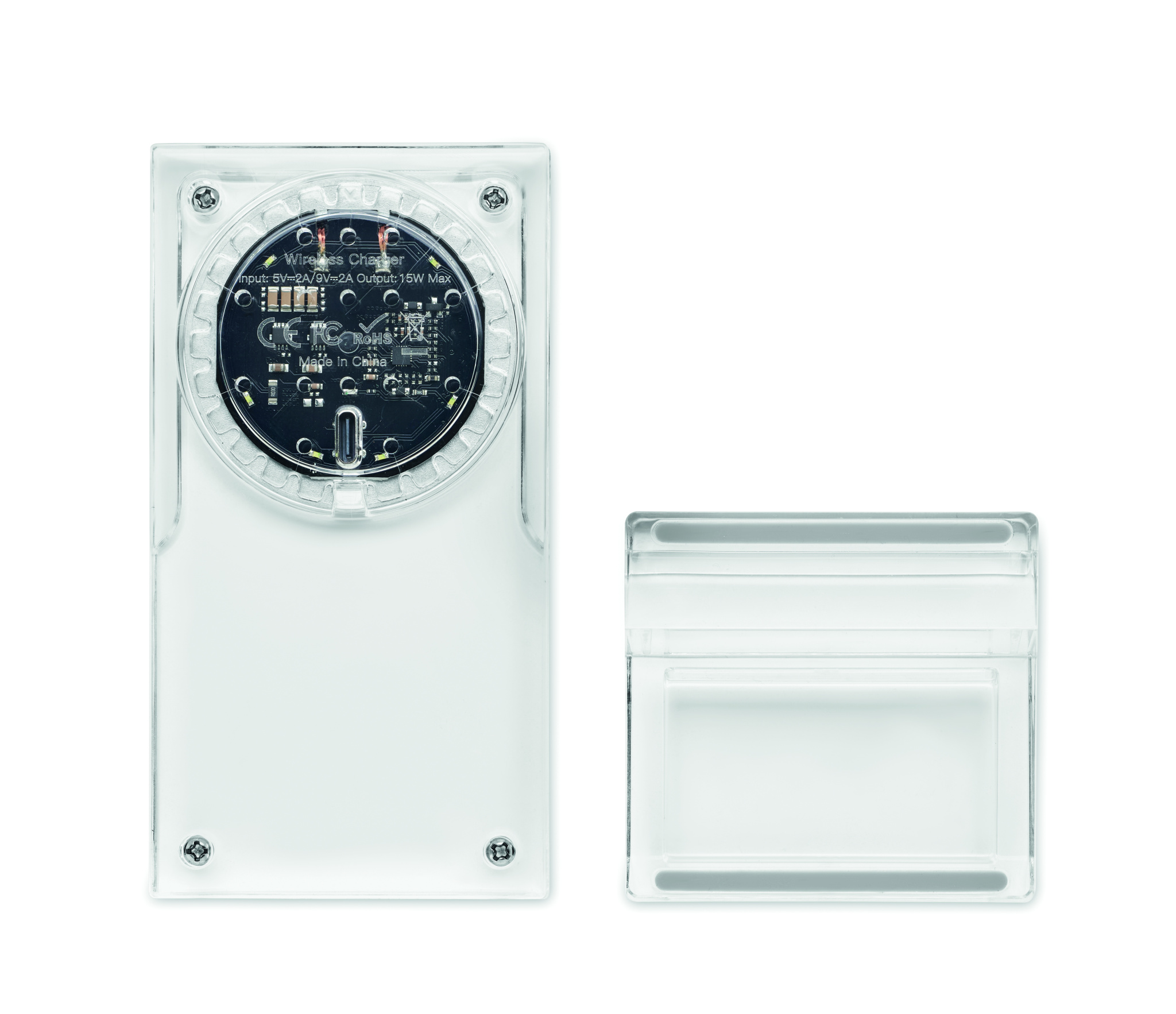 Belaidis įkroviklis (15 W) iš akrilo su telefono laikikliu. Prijungtas prie maitinimo šaltinio, jis įkraus jūsų mobilųjį įrenginį. Išvestis: 9 V / 1,67 A (15 W) greitam įkrovimui.