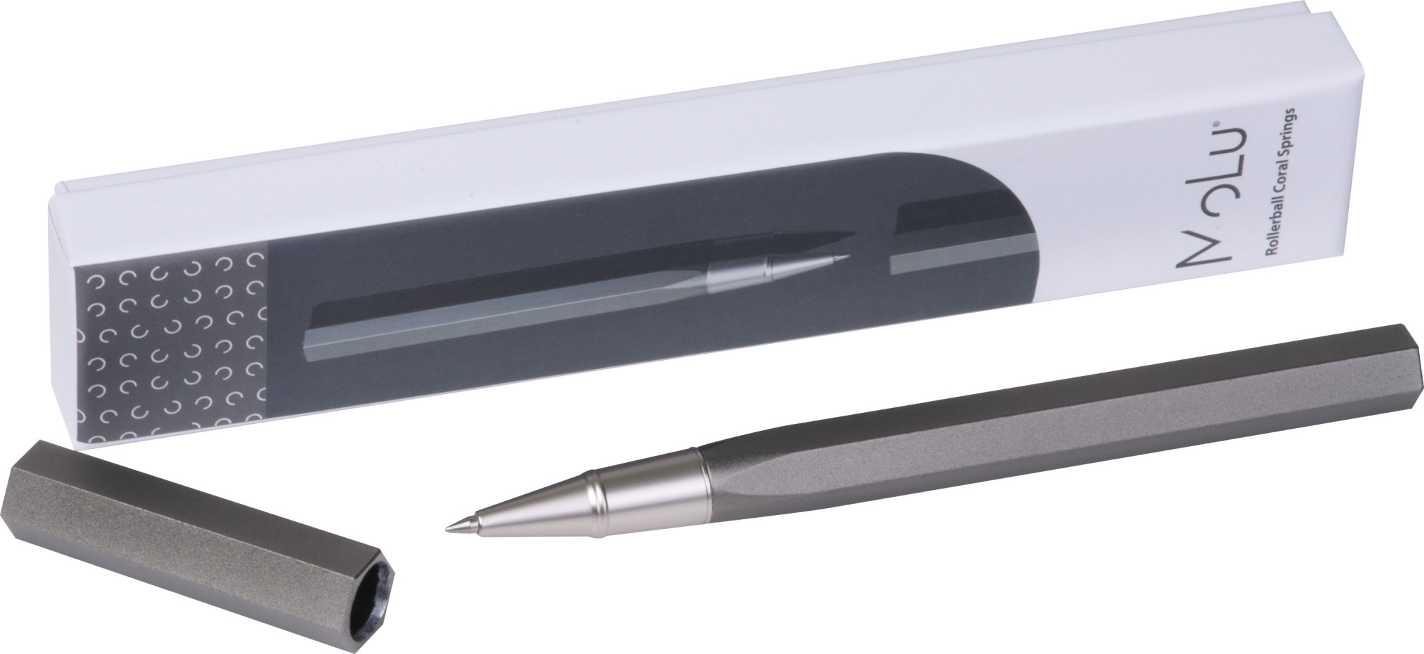 MoLu Coral Springs rullīšu pildspalva – drosmīgs dizains satiekas ar rakstīšanas kultūru. Elegants sešstūra korpuss ar izsmalcinātu MoLu logotipu augšpusē. Aprīkots ar uzticamo Parker sistēmu – lielas ietilpības, zila tinte un atkārtoti uzpildāms. Tā unikālā forma lieliski ieguļ rokā – stilīga, funkcionāla, nepārprotama.