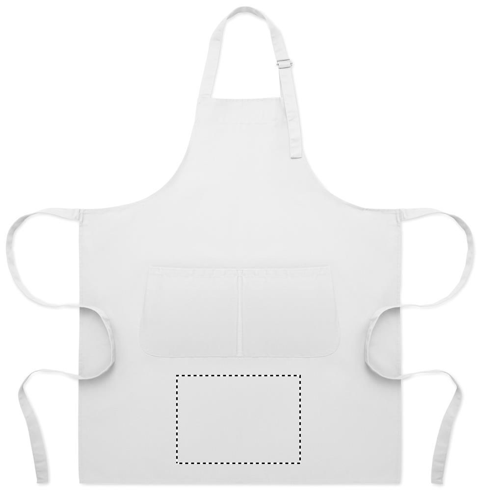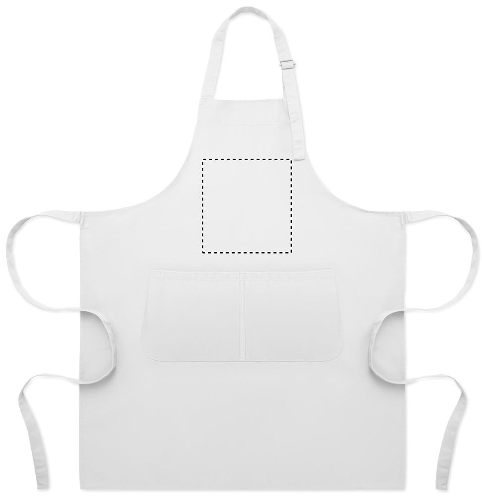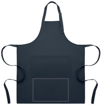 Long adjustable kitchen apron in 240 gr/m² polycotton (35% cotton, 65% polyester) with two front pockets and adjustable strap with metal buckle.