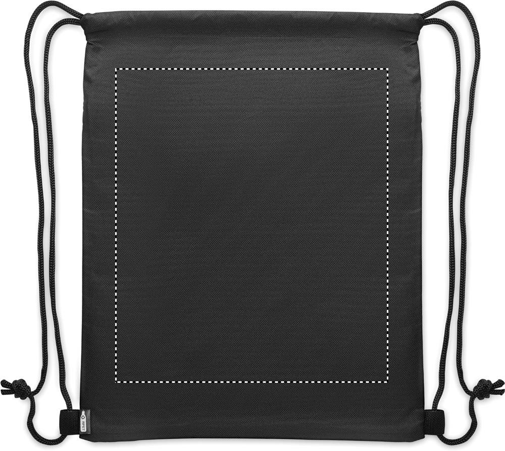 Drawstring bag with PU coated 600D RPET polyester and 190T RPET polyester lining. Zippered front pocket.