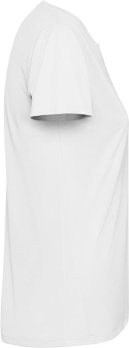 Приталенная футболка из технической ткани с короткими рукавами для женщин. Воротник со швами в цвет. Подол сзади немного длиннее переда. Боковые швы смещены вперед.