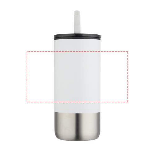 Стакан имеет двойные стенки и изоляцию, а также трубочку из переработанной нержавеющей стали с силиконовым наконечником для удобства использования. Внутренняя стенка изготовлена из пластика РР, а внешняя — из переработанной нержавеющей стали, сертифицированной RCS. Сдвижная крышка из пластика PS и ABS в сочетании с матовым покрытием придает стакану элегантный вид. Объем: 480 мл.