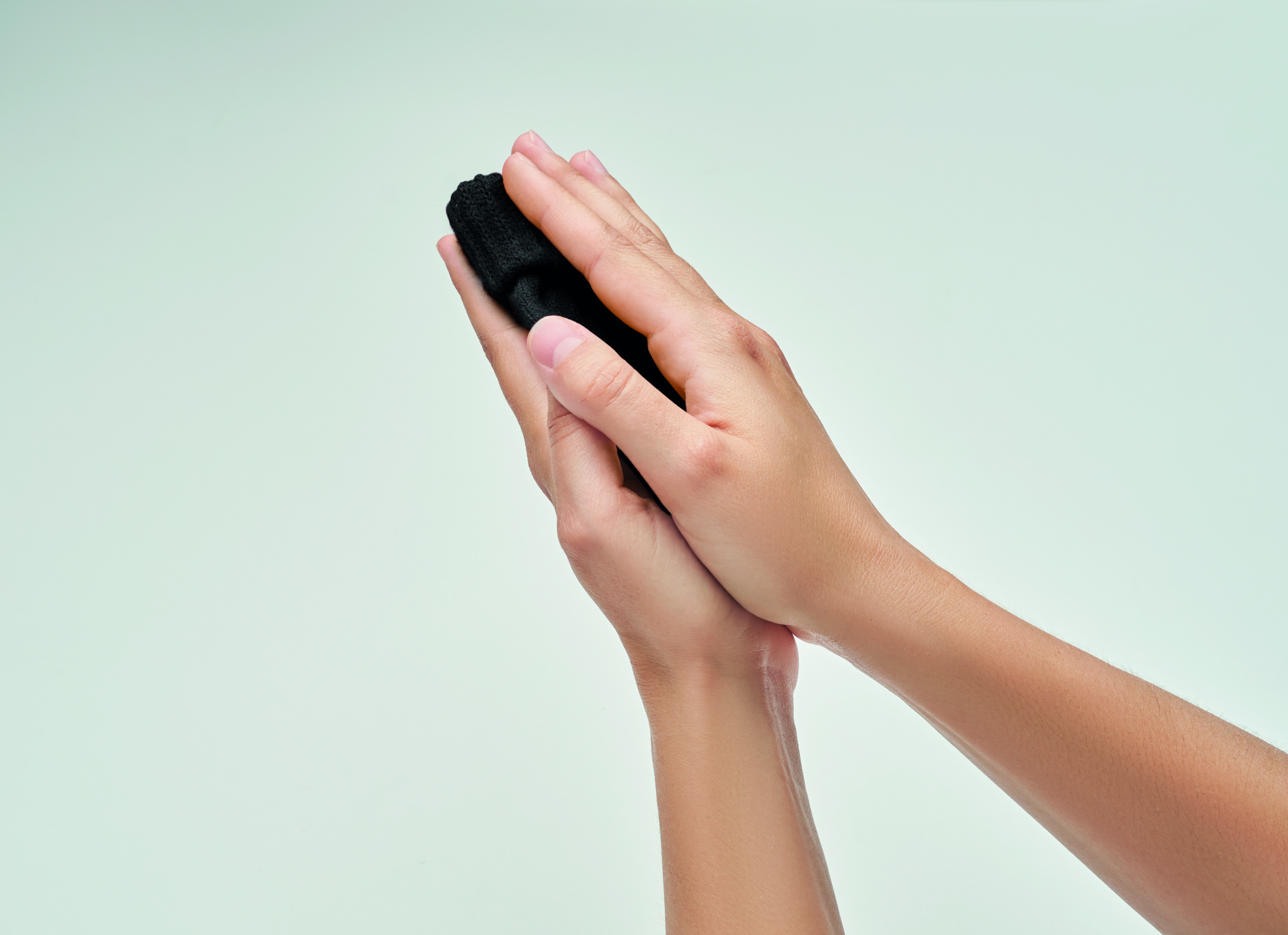 Hand warmer in knitted polyester. Includes instant heat pad in PVC to be activated by pressing the metal plate inside. Reusable by placing pad in hot water.