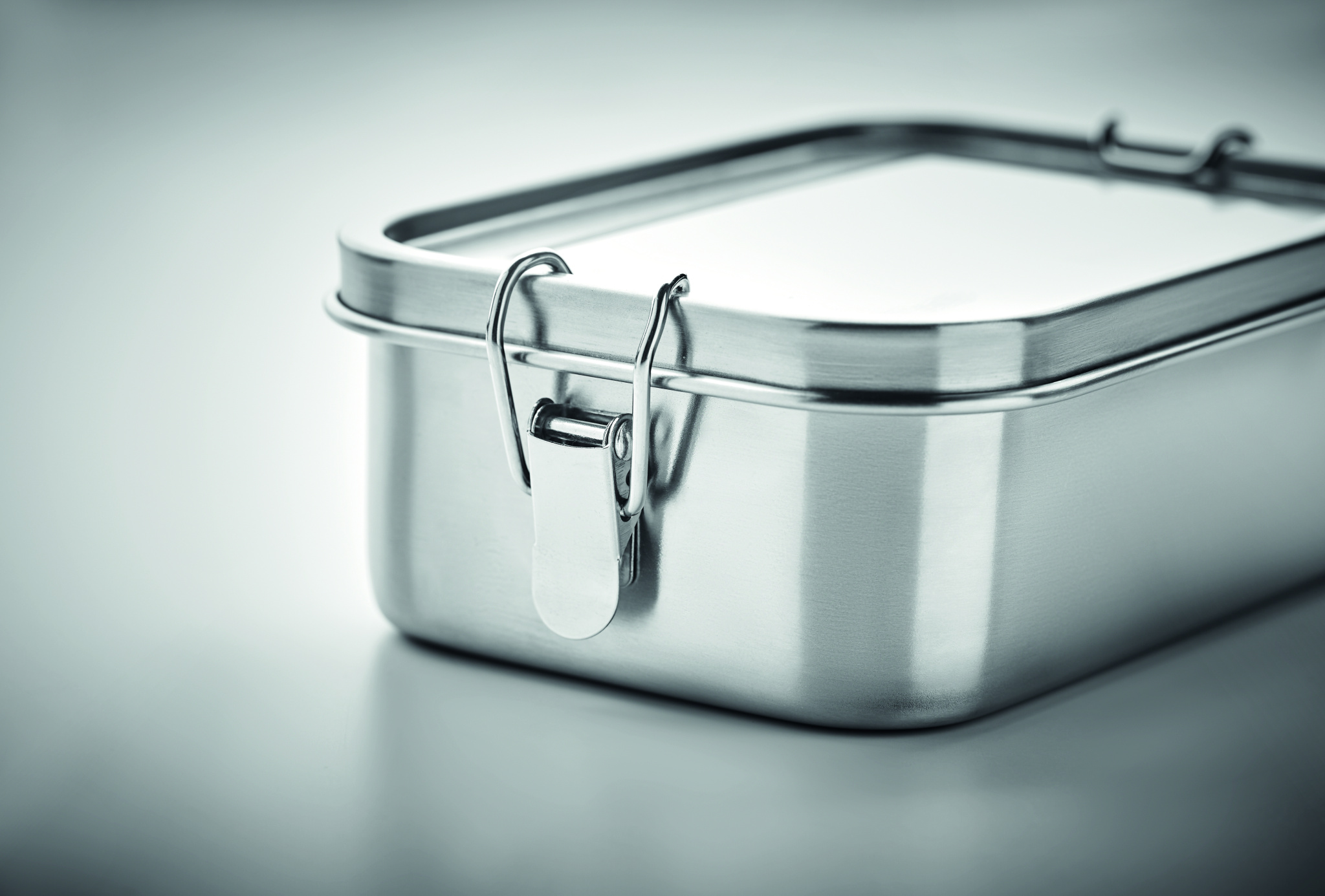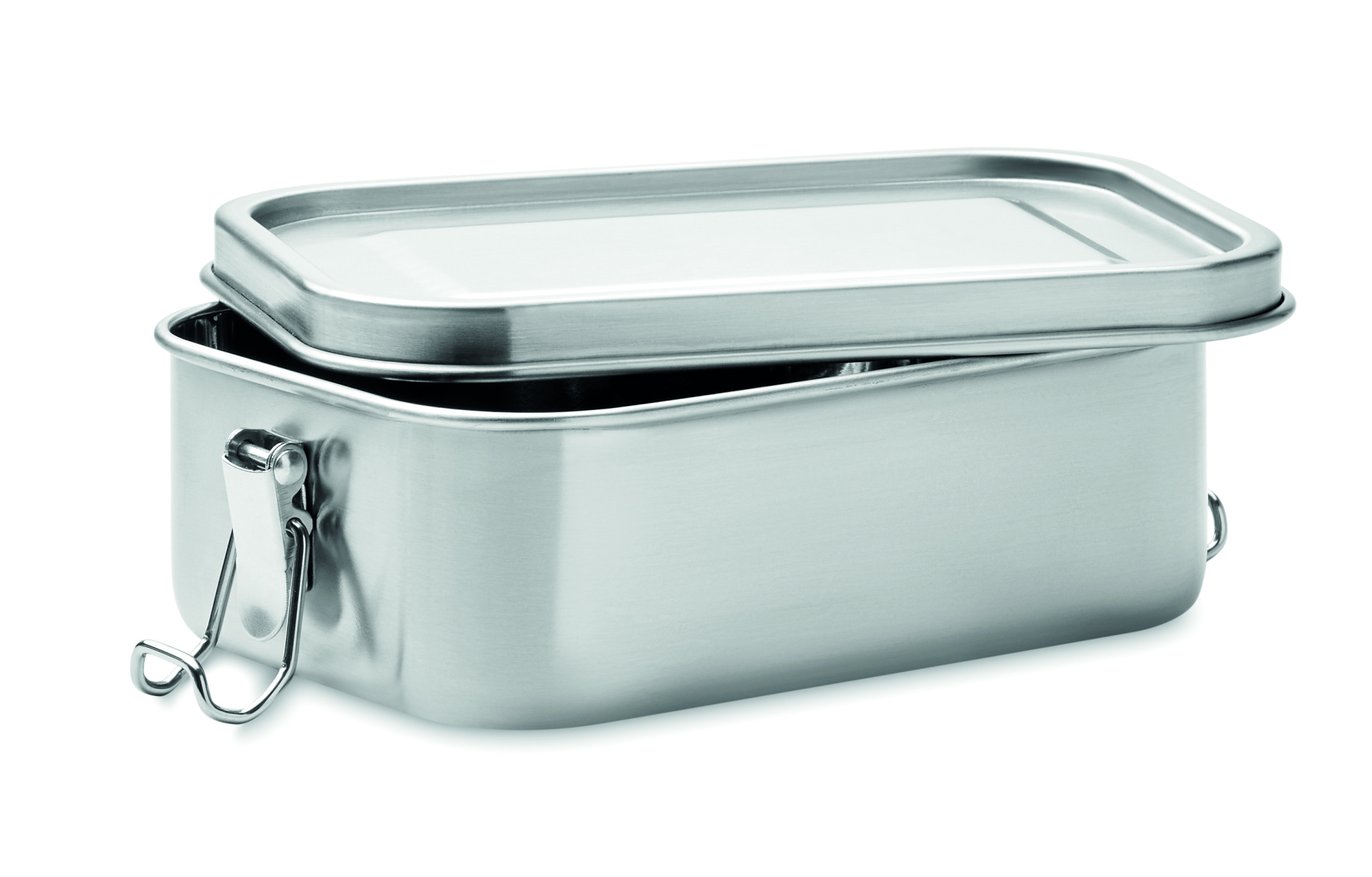 Recycled stainless steel (90 % recycled stainless steel and 10% stainless steel) lunch box with secure side buckles and round corners. Capacity: 750ml.