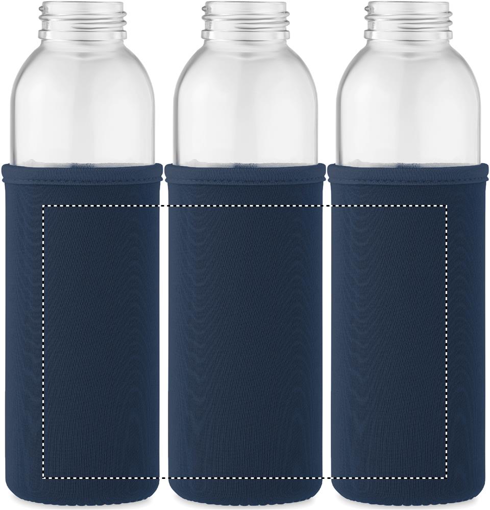 Glasflaska i återvunnet glas med neoprenpåse och PP-lock med silikonhängare. Läcker inte. Volym: 500ml.