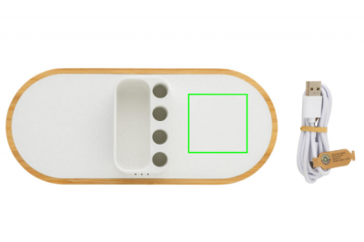 Dubbel 10W snabb trådlös laddare med pennhållare tillverkade av RCS (Recycled Claim Standard) certifierad återvunnen ABS. Totalt återvunnet innehåll: 31% baserat på total produktvikt. RCS certifiering säkerställer en helt certifierad leveranskedja av de återvunna materialen. Basen är tillverkad av FSC®100% bambu. Trådlös laddning är kompatibel med Android senaste generationen, iPhone 8 och upp. Kan ladda två enheter samtidigt. Med 4 hål för pennförvaring samt utrymme för förvaring av visitkort eller andra småsaker. Produkt och accessoarer är 100% PVC-fria. 120cm type C laddningskabel i RCS certifierad TPE medföljer. Levereras i FSC® mix kraft förpackning. Type-C in; Input 5V/2A; 9V/2A; trådlös output 5V/1A;9V/1.1A; (10W) Registrerad design®