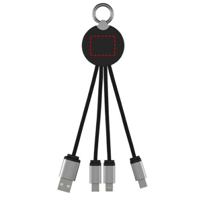 Laddningskabel i gummi med metallfinish och belyst logotyp. 3 st anslutningar (typ C, Android, iPhone). Upp till tre enheter kan laddas samtidigt. Längd på kablar (inkl. kontakter): 10 cm. Total kabellängd: 1 meter. RPET-plastkabel och förpackningen är tillverkad av återvunnet papper och återvunnen plast.