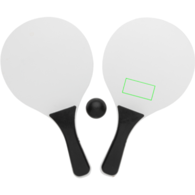Strandtennis-set i MDF med handtag i PP. Förpackat i nät, 1 boll medföljer.